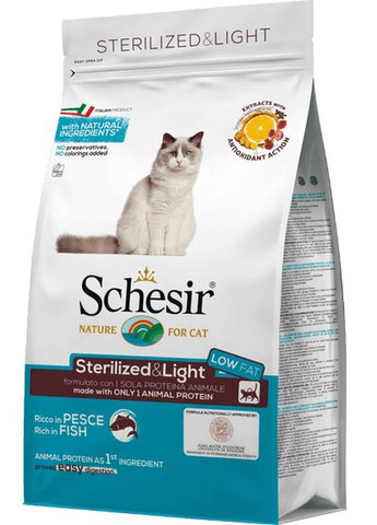 Schesir Cat Sterilized & Light – полноценный сбалансированный рацион, состоящий из натуральных ингредиентов с добавлением комплекса витаминов и минералов. С высоким содержанием рыбы без добавления других источников животного белка – монопротеиновая формула. Специально адаптирован под метаболизм стерилизованных кошек и кастрированных котов, а также для котов склонных к полноте. Полностью удовлетворяет потребности котов в питании и помогает им оставаться здоровыми. Минимизирует риски возникновения пищевой аллергии, поскольку не содержит красителей и консервантов, включает только 1 источник легкоусвояемого белка животного происхождения и источники жира высокой степени очистки. Монопротеиновый корм Schesir – здоровье и долголетие вашего домашнего любимца! Сухой корм Schesir производится только из продуктов животного происхождения от здоровых животных, пригодных для использования в сегменте человеческих продуктов. В составлении рационов используются рекомендации факультета ветеринарной медицины - Alma Mater Studiorum Болонского университета. Почему стоит купить корм для котов Schesir Sterilized & Light: монопротеиновая формула: в составе только один источник легкоусвояемых белков животного происхождения – рыба (26%); сбалансированный рацион, удовлетворяет все потребности стерилизованных кошек и кастрированных котов, а также котов с избыточным весом в питании и помогает им оставаться здоровыми; приготовлен из натуральных ингредиентов с добавлением комплекса витаминов и минералов; здоровье сердечно-сосудистой системы и поддержка здорового веса благодаря низкому содержанию жира (11%) и высокому содержанию клетчатки по сравнению с обычным кормом (4%); баланс содержания белка (35%) при сниженной калорийности – гарантия отличной кондиции и активности вашего питомца; минимизирует риски проявления пищевой аллергии; хорошо переваривается; отличная усвояемость в сочетании со сбалансированным содержанием питательных веществ обеспечивает поддержание оптимального веса, а также укрепляет кости и мышцы; правильное соотношение Омега-3 и Омега-6 жирных кислот для крепкого иммунитета, здоровья сосудов и суставов; содержит ингредиенты с пребиотическим действием: ФОС (фруктоолигосахариды), пивные дрожжи, мякоть цикория, которые укрепляют иммунитет, способствуют здоровому пищеварению и полноценному усвоению корма; здоровье шерсти и кожи: пивные дрожжи, Омега-3 и Омега-6 (масло лосося, очищенный жир животного происхождения, подсолнечное масло), биотин; обогащен особой смесью экстрактов с антиоксидантным синергетическим действием, которая защищает клетки от свободных радикалов и помогает бороться с клеточным старением (экстракты розмарина, куркумы, винограда, цитрусовых, масла гвоздики) – для здоровья и долголетия вашего питомца; без красителей и консервантов; не содержит пшеницу и сою; контроль над запахом благодаря экстракту юкки Шидигера. Ингредиенты: 26% мука из рыбы (10% тунец, 8% скандинавская рыба, 8% лосось), рис, ячмень, кукурузная клейковина, картофельный белок, очищенный жир животного происхождения, сушеная мякоть свеклы, растительная клетчатка, 1% пивные дрожжи, 1% фруктоолигосахариды (ФОС), 1% мякоть цикория, 1% масло лосося, подсолнечное масло, пиро фосфат натрия, хлорид калия, 0.1% юкка Шидигера. Добавки/кг: Витамин А – 31 000 МЕ, витамин D3 – 1600 МЕ, витамин B6 – 10 мг
