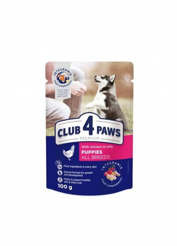 Влажный рацион Club 4 Paws для щенков всех пород содержит 73% мясных ингредиентов в каждом кусочке и специальную формулу роста с высоким содержанием курицы (25%) для здорового развития в первые 12 месяцев жизни. Преимущества : 8/7 - сбалансированная формула роста и развития для ежедневного кормления. Для щенков в возрасте до 1 года