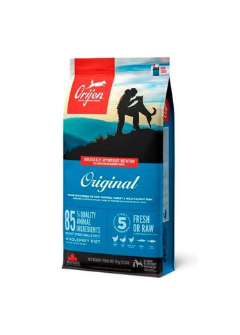 Сухой корм Orijen Original Dog — это биологически соответствующий корм для собак всех пород и всех стадий жизни. Высокопротеиновый (38%), с ограниченным количеством углеводов (19%), Orijen обеспечивает питание щенков, в соответствии с их эволюционными и биологическими потребностями. Не идя в сравнение с любыми другими кормами для собак, 2/3 мясных ингредиентов в составе Orijen являются свежими (охлажденными, без добавления консервантов) или сырыми (мгновенно замороженными, без добавления консервантов). 1/3 – это мясо, высушенное при температуре 90°C – концентрированный источник мясных протеинов. Высокопитательное соотношение ингредиентов WholePrey, включая мясо, органы и хрящи в сочетании с цельной рыбой и цельными гнездовыми яйцами является природным источником практически всех питательных компонентов, необходимых собакам. Единственная добавка – это цинк. Включения лиофилизированной печени усиливают природный аромат, делая Orijen непревзойденным выбором даже для самых привередливых в еде питомцев. Состав: Свежее мясо цыпленка (13%), свежее мясо индейки (7%), свежие цельные яйца (7%), свежая куриная печень (6%), свежая цельня сельдь (6%), свежая цельная камбала (5%), свежая печень индейки (5%), свежие куриные шейки (4%), свежее куриное сердце (4%), свежее сердце индейки (4%), цыпленок (дегидратированный, 4%), индейка (дегидратированная, 4%), цельная макрель (дегидратированная, 4%), цельная сардина (дегидратированная, 4%), цельная сельдь (дегидратированная, 4%), красная чечевица, зеленый чечевица, зеленый горошек, клетчатка чечевицы, нут, желтый горошек, фасоль пестрая, фасоль белая, жир из сельди (1%), куриный жир (1%), куриные хрящи (1%), куриная печень (лиофилизированная), печень индейки (лиофилизированная), тыква, мускатная тыква, цуккини, пастернак, морковь, яблоки, груши, капуста Кале, шпинат, зелень свеклы, зелень репы, ламинария, клюква, черника, ягоды ирги, корень цикория, корень куркумы, расторопша, корень лопуха, лаванда, корень алтея, плоды шиповника. Добавки (в 1 кг): пищевые добавки: цинка хелат 100 мг. Зоотехнические добавки: Enterococcus faecium NCIMB10415: 600x10 ^ 6 КОЕ. Энергетическая ценность: 3900 ккал/кг или 470 ккал на чашку 250 мл (120 г), где источником 39% энергии является протеин, 19% фрукты и овощи, 42% из жира.