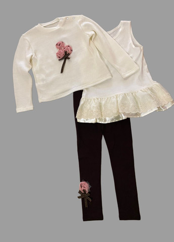Красивый костюм для девочки, тройка. Свитер белого цвета, декорированный цветами из ткани, застегивается на кнопкт на плече, хлопковая белая туника, декорированная кружевом, хлопчатобумажные леггинсы, коричневого цвета, декорированные цветами из ткани, пояс на резинки. Состав свитер 30% шерсть, 3% вискоза, 40% полиэстер, туника и леггинсы 80% хлопок, 20% полиэстер. Размеры 104, 122, 128 Длина свитера – 40 см., 44 см., 46 см. Длина рукава – 40 см., 47 см., 50 см. Длина туники – 47 см., 53 см., 55 см. Длина леггинсов по шаговому шагу – 45 см., 58 см., 59 см.