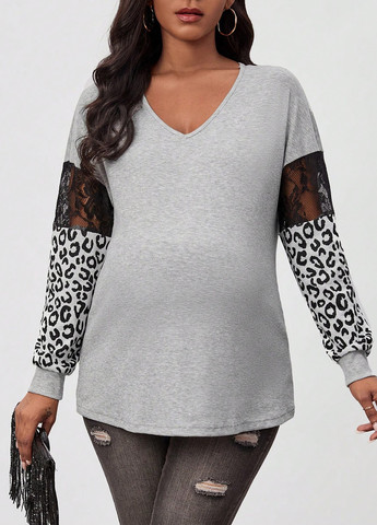 Футболка для беременных с леопардовым принтом, непринужденным дизайном с V-образным вырезом и рукавами длиной три четверти. Модель свободного кроя, длинной длины и заниженными рукавами изготовлена из легкого, слегка эластичного трикотажного полотна.