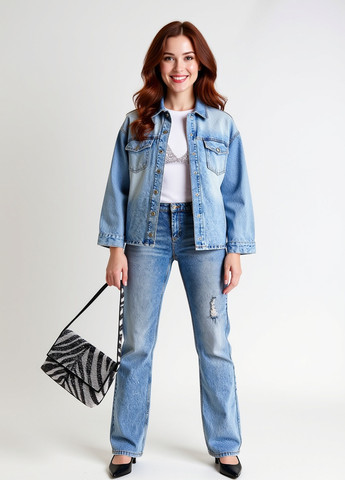 Цвет Светло-голубой / Фасон Клеш / Высота посадки Высокая талия / Декор Потертости, Бахрома / Сезонность Демисезон
