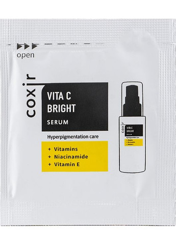С возрастом кожа прекращает производить коллаген и эластин, поэтому с течением времени появляются первые признаки старения, прыщи, угри, а внешний слой не справляется с агрессивным воздействием окружающей среды. Для решения таких задач и была создана сыворотка для лица с витамином С бренда Coxir. Пробник позволит вам попробовать на себе влияние витаминов С, Е, В3 и А, улучшающих состояние кожного покрова, возвращая ему упругость, гладкость, ровный тон и микрорельеф. Особенности Coxir Vita C Bright Serum (пробник): - освещает нежелательную пигментацию; - дарит природное сияние и яркость; - устраняет тусклость и серость; - интенсивно увлажняет и питает клетки; - витамин С стимулирует образование коллагеновых волокон; коллагена; - улучшает состояние кожи при воспалениях и дерматозах; - защищает от повреждений, вызванных УФ-лучами; - витамин А борется с угрями, прыщами и черными крапинками; - повышает упругость и эластичность; - выравнивает тон и микрорельеф; разрушение; - предохраняет от фотостарения; - укрепляет липидный барьер; - успокаивает раздражение; - ускоряет регенерацию эпидермиса; - витамин В3 активизирует клеточное обновление; - повышает местный иммунитет.