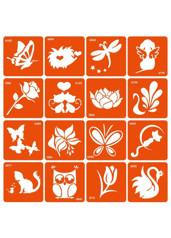 Коллекция трафаретов Троллей, Хелло Китти, свинки Пепы, 16 штук в размере 6 на 6 см Как сделать био-тату: выберите равномерный участок кожи; хорошо обезжирьте его; снимите с трафарета белую подложку (бумажная основа трафарета); приклейте трафарет на сухую и обезжиренную кожу; акуратно снимите прозрачную пленку и убедитесь, что трафарет (оранжевая часть) плотно приклеен к коже; нанесите равномерный слой клея для боди-дизайна и дайте ему просохнуть (от 30 секунд до 2 минут в зависимости от слоя клея);нанесите глиттер (блестки) на клей и плотно вбейте его кистью для глиттера; смахните излишки глиттера кистью-сметкой и снимите трафарет. Для чего нужен трафарет: если не умеете рисовать от руки; если нужно много и быстро рисовать; нужно создавать одинаковые и по размеру, и по внешнему виду рисунки - воспользуйтесь трафаретами Fresh Tattoo; трафареты Fresh Tattoo безопасны для кожи и подходят ля нанесения временных тату всех типов: глиттер-тату, хной, бархатом, пигментом, джагуа-гелем и так далее; подходят для химического или пескоструйного матирования изделий из стекла (чашки, бокалы, зеркала);