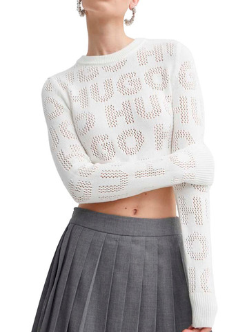 Укороченный джемпер из весенне-летней коллекции HUGO подчеркнет стиль и сделает образ ярким и запоминающимся. Женственная модель выполнена из смесового хлопка и декорирована перфорированным логотипом по всей поверхности. Джемпер стандартного кроя актуален и комфортен при любой погоде, он идеально подойдет для создания образов на прогулку, работу и на каждый день. Изделие идеально сочетается с брюками, джинсами или юбкам на завышенной талии.