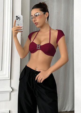Женский модный топ-бандо SHEIN LUNE, черно-белый. Этот топ с принтом по всей поверхности. Длина укороченная, облегающий крой. Топ выполнен из трикотажной ткани на основе полиэстера и эластана. С вырезами и открытой спиной. Можно стирать в стиральной машине или чистить в химчистке.