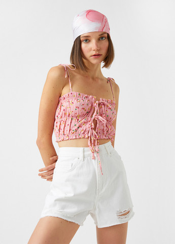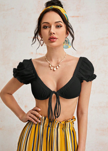 Плиссированный укороченный топ с завязанными бретелями и оборками. Вырез в форме сердца, облегающий крой и короткие рукава-фонарики. Изготовлен из неэластичной ткани.