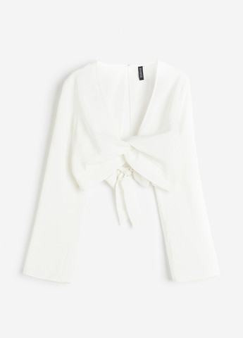 Укороченная блузка из тканой ткани с длинными широкими рукавами. Глубокий V-образный срез спереди с декоративным узлом. Отчасти открытая спина с застежкой на крючок сверху и широкими завязками по низу.