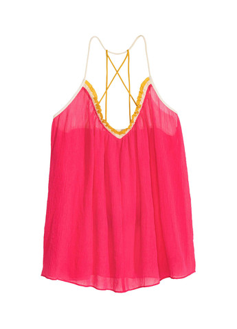 Топ без рукавов из жатой вискозной ткани с вшитой кружевной лентой спереди. Короткие узкие бретели, вырез на пуговице сзади на шее. Низ с эластичным швом и воланами. Возможно повреждение бирки.