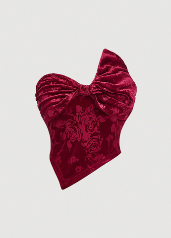 Топ SunnyBelle с длинным рукавом с цветочным принтом, рюшами по низу и узлами. Стиль бохо с V-образным вырезом и длинными рукавами. Изготовлен из неэластичной ткани. Облегающий крой, укороченная длина и расклешенный подол.