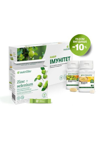 Артикул: 200690 Вес/объем: 1 набор Nutrilite™ Набор «Иммунитет» – это трио продуктов для поддержки работы иммунной системы*. В комплексе они оказывают более сбалансированное и быстрое влияние на ее работу и укрепление. Набор содержит: Nutrilite™ Цинк+селен (арт. 126811). Эта синергическая комбинация цинка и селена в удобном формате для применения на ходу обеспечивает вас минералами для поддержания иммунной системы и нормального состояния волос и кожи. Nutrilite™ Витамин C плюс (ст. 109741). Диетическая добавка на основе концентратов вишни ацеролы и цитрусовых биофлавоноидов, полученных из цельных фруктов, в частности из лимона, мандарина, апельсина и грейпфрута, которая способствует защите клеток от оксидативного стресса и нормальной работе иммунной системы. Nutrilite™ Витамин D (ст. 119797). Эта диетическая добавка способствует поддержанию нормального состояния костей и зубов, поддержанию нормальной функции мышц и нормальной работе иммунной системы. 1 таблетка обеспечит суточную дозу 15 мкг (600 МЕ) витамина D, полученного из природных источников. Покупая продукты в составе набора, вы экономите 10%! * Витамин С, витамин D, цинк и селен способствуют нормальной работе иммунной системы. ¹Цинк и селен способствуют нормальной работе иммунной системы. ²Цинк и селен способствуют поддержанию нормального состояния волос. ³Цинк способствует поддержанию нормального состояния кожи. Nutrilite™ Цинк+селен (арт. 126811): Состав: наполнитель (сорбит), глюконат цинка, кислота (лимонная кислота), экстракт ацеролы (Malpighia punicifolia L.) (1,1 %), ароматизаторы, антисжигающие агенты (диоксид кремния, магниевые соли жирных кислот), подсластитель. Nutrilite™ Витамин С плюс (ст. 109741): Состав: L-аскорбиновая кислота, стабилизаторы (микрокристаллическая целлюлоза, гидроксипропилметилцеллюлоза, метилцеллюлоза), экстракт ацеролы 15% (Malpighia punicifolia), концентрат грейпфрута (Citrus paradisi), концентрат королевского. sinensis), антисжигающие агенты (магниевые соли жирных кислот, диоксид кремния), мальтодекстрин, концентрат лимона (Citrus limon), увлажнитель (глицерин), глазующий агент (карнаубский воск). Nutrilite™ Витамин D (ст. 119797): Состав: мальтодекстрин, стабилизаторы (микрокристаллическая целлюлоза, натрия арбоксиметилцеллюлоза трехмерная, гидроксипропилметилцеллюлоза), витамин D из дрожжевых грибов 3%, модифицированный крахмал, антисжигающие агенты (диоксид кремния, диоксид кремния (глицерин), аскорбат натрия), триглицериды средней цепи, антиоксидант (альфа-токоферол), холекальциферол (витамин D3), глазующий агент (карнаубский воск).
