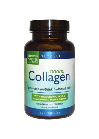 NeoCell Marine Collagen – морской коллаген для молодости, здоровья и увлажнения кожи. Около четверти всего белка в организме коллаген. Кости и зубы сформированы путем добавления минеральных кристаллов с коллагеном. Гиалуроновая кислота входит в состав: хрящевой ткани, синовиальной суставной жидкости, стекловидного тела, кровеносных сосудов, кожи. Содержание гиалуроновой кислоты в коже и других тканях снижается с возрастом и требует приема препаратов с содержанием гиалуроновой кислоты. Препарат является природным гелеобразователем, обладает регенеративными, противовирусными, противовоспалительными, заживляющими свойствами. Гиалуроновая кислота – источник биологически активной серы, способствующий улучшению состояния соединительной ткани, вен и сосудов. Среди активных ингредиентов продукта Marine Collagen следует выделить: запатентованную форму морского коллагена, который выступает как строительный материал для соединительных и эпителиальных тканей, мышц, хрящей, связок и, конечно же, кожи; гиалуроновая кислота – разглаживает мелкие морщинки, питает и тонизирует кожу, придает ей здоровый блеск, упругость, равномерный цвет, гладкость, эластичность, улучшает гидратацию; минералы цинк, медь и кремний – укрепляют кожный покров, участвуют во многих обменных процессах, необходимых для выработки и насыщения кожи витаминами, аминокислотами и другими нутриентами; витамины группы В – стимулируют белковый метаболизм, необходимый для восстановления разрушенных клеток кожи, а также активного обновления эпителия; витамин С – важнейший антиоксидант, препятствующий развитию окислительного стресса и воздействию свободных радикалов, омолаживает кожу и замедляет природное старение. Питательная ценность в одной порции - 4 капсулы: Витамин C (аскорбиновая кислота) - 40 мг Витамин В6 (пиридоксин HCl) - 1,32 мг Витамин В12 (цианокобаламин) - 0,4 мкг Магний (оксид магния) - 132 мг Цинк (оксид цинка) 1,32 мг. Морской коллаген – 2000 мг. Гиалуроновая кислота – 20 мг. Кремний (диоксид кремния) – 13,2 мг. Другие ингредиенты: Морские желатиновые капсулы могут содержать растительный стеарат магния. Не содержит сою, пшеницу, лактозу, крахмал, дрожжи или искусственные ароматизаторы. Предупреждение об аллергенах: содержит рыбу (тилапию). Рекомендации по применению: Принимать по 2 капсулы дважды в день. Для наибольшего усвоения принимать на пустой желудок. Хранить в недоступном для детей месте.