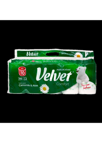 Velvet туалетная бумага Camomile&Aloe 10 рулонов 3 слоя 200 отрывов – мягкая туалетная бумага с нежным ароматом ромашки и алоэ, которая дарит ощущение комфорта и свежести. Благодаря трехслойной структуре, он обеспечивает отличную мягкость и надежность, а каждый рулон имеет 200 отрывов для экономии. Идеален для ежедневного использования, особенно для чувствительной кожи.