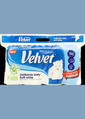 Туалетная бумага Velvet Soft White состоит из трех слоев мягкой папиросной бумаги в сочетании с нежным рельефным узором с фигурками мишек. Каждый лист – это оптимальное сочетание прочности и бархатной мягкости бумаги Velvet. Velvet Soft White – попробуйте сегодня!