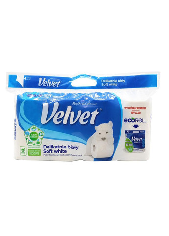 Туалетная бумага Velvet Delicate White ecoROLL состоит из трех слоев мягкой папиросной бумаги в сочетании с нежным рельефным рисунком с фигурками мишек. Бумага создавалась с учетом природы, поэтому четыре рулона двойной длины – ecoROLL заменяют восемь обычных рулонов бумаги. В результате для упаковки ecoROLL использовалось меньшее количество пластика, что привело к уменьшению количества отходов. Кроме того, продукт занимает меньше места во время транспортировки, что означает меньшее количество грузовиков для транспортировки продуктов и, таким образом, уменьшение количества выхлопных газов, образующихся в воздухе. Это уникальное предложение: удобство, экономия и экономия места в ванной!