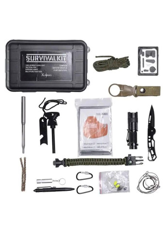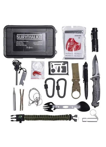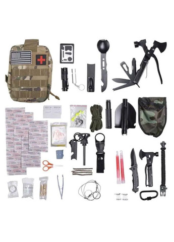 Тактический набор для выживания - идеальный комплект для активного отдыха, походов, кемпинга и путешествий. Он станет незаменимым помощником в экстремальных условиях и в автомобиле, помогая справиться с неожиданными ситуациями и обеспечивая максимальную безопасность. Компактный и удобный, набор содержит все необходимое для выживания, включая инструменты, освещение, средства для разжигания огня, рыбалки и оказания первой помощи. Благодаря прочному тканевому кейсу его можно легко закрепить на рюкзаке или поясе, что делает этот набор универсальным для любого пользователя. Основные характеристики: Размер: 22х17х15 см; Материал кейса: ткань. Комплектация туристического набора: тактическая саперная лопатка; кемпинговый мультитул; мультитул карманный; тактическая ручка; универсальная ложка; кемпинговый фонарь; мультитул-карта; держатель для бутылки на пояс; паракордовый браслет 6 в 1 (свисток, кресало, компас, скребок); походный мультитул (ложка-вилка-нож, свисток); фонарик; набор для розжига костра (кресало и огниво, трут); паракордовый шнур; спасательное одеяло; спасательная термопалатка; рыболовное снаряжение; 3 карабина; водонепроницаемый чехол для телефона; высокочастотный свисток; дождевик; компас; химические фонарики; аптечка первой помощи (щипцы, ножницы, перчатки, пластыри, спиртовые салфетки, ватные палочки, жгут, бинт); проволочная пила; набор булавок. Этот набор – идеальный спутник для путешественников, любителей экстремального отдыха и всех, кто хочет быть готовым к любой ситуации. Компактность, надежность и продуманная комплектация делают его отличным выбором как для личного пользования, так и в качестве подарка.