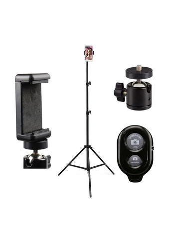 Штатив c держателем для телефона и шарниром до 2-х метров / Штатив для телефона + кнопка ДУ В сложенном состоянии всего 70 см. Максимальная высота 2 метра. При этом, высота штатива регулируемая и Вы можете выставить на любой нужной для Вас высоте начиная от 70 см до 200 см. Благодаря своим широким ножкам, штатив очень устойчив. В комплекте с данным штативом идет надежное и качественно крепление для телефона, шарнирная головка и кнопка для управления телефоном дистанционно. Что позволяет фиксировать телефон под любым углом. Вертикально или горизонтально и делать снимки или видео на расстоянии. Технические характеристики: Тип головки: Шаровая Кнопка: есть в комплекте Винт под штативное гнездо: 1/4" Минимальная высота съемки: 70 см Максимальная высота съемки: 200 см Количество секций: 3шт Материал: Алюминиевый сплав / Пластик Длина в сложенном состоянии: 70 см Вес: 0.5 г. Цвет: Черный Комплектация: Штатив с регулировкой высоты (от 70 см до 2-х метров) Зажим для телефона (держатель) Шарнирная головка (механизм для фиксирования телефона под любым углом и в любом положении) Кнопка для дистанционного уплавдения камерой (включение фото/видео) Коробка