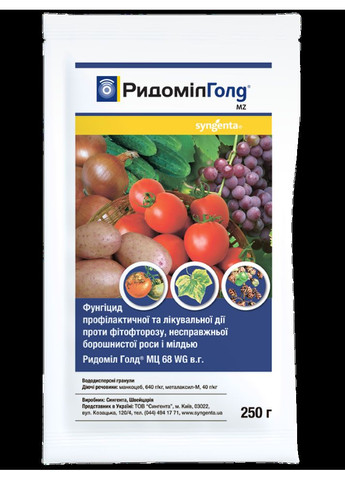 Фунгицид Ридомил Голд – мощный комбинированный фунгицид, сочетающий системное и контактное действие благодаря двум активным веществам: металлаксил-М и манкоцеб. Такая комбинация позволяет препарату эффективно проникать в ткани растений (трансламинарное и системное действие), распространяться внутри, обеспечивая комплексную защиту как вегетативных органов – листьев и стеблей, так и генеративных частей – плодов, клубней, ягод. Ридомил Голд не только предотвращает поражение болезнями, но и оказывает лечебное, искоренительное и антиспорулянтное действие, останавливая развитие патогенов даже на начальных стадиях заболевания (до 5% поражения). Его особенность – длительный период защиты, составляющий до 14 дней, что существенно превышает среднюю продолжительность действия аналогичных препаратов. Нормы внесения Нормы внесения КУЛЬТУРА НОРМА РАСХОДЫ ПРЕПАРАТА НОРМА РАСХОДЫ РАБОЧЕГО РАСТВОРА ВРЕДНЫЕ ОБЪЕКТЫ РАБОТНОСТЬ ОБРАБОТК / СРОК ОЖИДАНИЯ (ДНИ) Картофель, томаты 25 г на 5 л воды альтернариоз 3/14 Огурцы Переноспороз 3/10 Лук (кроме на перо) Ненастоящая мучнистая роса 3/30 Табак Переноспороз 3/14 Виноград 25 г на 6-8 л воды 1,5-2 л раствора на куст Милдью 2/ч раствора на растение Фитофтороз 2/- При возникновении риска сильного развития болезни выдерживать более короткие интервалы между обработками (10 дней). Ридомил Голд отличается низкой токсичностью (ЛД₅₀ > 2000 мг/кг), является безопасным для пчел, птиц и окружающей среды, поэтому его применение является не только эффективным, но и экологически оправданным. ДЕЙСТВИТЕЛЬНОЕ ВЕЩЕСТВО: 640 г/к Манкоцеб + 40 г/кг металлаксила-М Основные свойства: Биологически эффективная комбинация системного и контактного фунгицидов: надежная защита против болезней даже при неблагоприятных погодных условиях; Профилактическое и лечебное действие; Защита нового прироста и клубней. Совместим с большинством фунгицидов и инсектицидов. В каждом конкретном случае следует проводить тесты на совместимость.