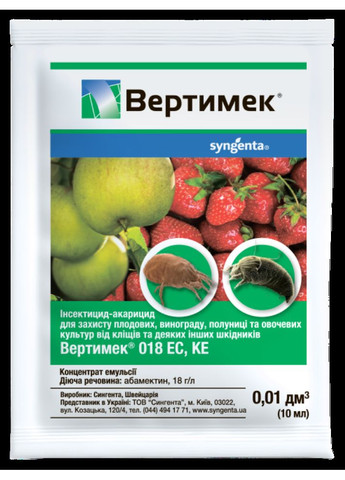 Инсектоакарицид широкого спектра действия Вертимек – это препарат нового поколения, эффективно защищающий овощные культуры, яблони и клубнику от клещей, трипсов и проходящих молей. Его уникальность состоит в том, что он принадлежит к химической группе авермектинов – соединений, являющихся продуктами жизнедеятельности почвенного грибка Streptomyces avermectilis. Именно поэтому Вертимек сочетает преимущества химического и биологического средства. После обработки препарат быстро (за 2–4 ч) проникает в листовую ткань, где накапливается в виде микрорезервуаров. Благодаря этому Вертимек оказывает мощное трансламинарное действие, защищая лист с обеих сторон. Его действие – контактное и кишечное: вредители погибают в процессе питания, а полная гибель клещей наступает уже через 1–3 дня. Нормы внесения Нормы внесения КУЛЬТУРА НОРМЫ РАСХОДА ПРЕПАРАТА НОРМЫ РАСХОДА РАБОЧЕЙ ЖИДКОСТИ ВРЕДНЫЕ ОБЪЕКТЫ КРАТНОСТЬ ОБРАБОТК / СРОК ОЖИДАНИЯ (ДНИ) Клубника 10 мл на 5 л воды 1,5 Земляничный и паутинный клещи, тля 2/7 Перец сладкий, баклажаны 5 л раствора на сотку Клещи, трипсы, тля, колорадский жук Огурец 5 л раствора на сотку Клещи, трипсы, тля, белокрылка Яблоня 10 мл на 8-10 л размера кроны Клещи, тля, медяница 2/14 Груша грецкий орех Клещи 2/14 Виноград 1,5 л раствора на куст Клещи, листовая филлоксера 2/14 Соя 0,6 - 1,0 л на 400 л воды 400 л пара на 2 проникает в плоды, не накапливается, а под действием солнца быстро разлагается (в течение 12 часов), что делает его безопасным для полезных насекомых. ДЕЙСТВИТЕЛЬНОЕ ВЕЩЕСТВО: 18 г/л Абамектин Основные свойства: Эффективно контролирует все виды клещей, минеров, трипсов и медяниц; Непревзойденное трансламинарное действие обеспечивает устойчивость к смыванию дождем, высокий уровень контроля вредителей и самый длительный период защитного действия среди акарицидов; За счет четко выраженного кишечного и умеренного контактного действия препарат эффективно защищает от вредителей, но остается безопасным для полезной энтомофауны. Чтобы предотвратить возникновение резистентности, не следует использовать вне очереди (более трех раз) с другими препаратами из химической группы авермектинов. Для повышения эффективности препарата против вредителей желательно применять рабочий раствор утром, вечером или в пасмурную погоду.