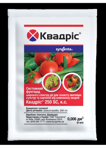 Фунгицид системного действия Квадрис – это современный высокоэффективный фунгицид нового поколения, созданный на основе действующих веществ класса стробилуринов. Его универсальное действие охватывает весь спектр грибковых заболеваний овощных культур, таких как фитофтороз, мучнистая и ложная мучнистая роса, макроспориоз, пятнистость и т.д. Благодаря способности проникать в ткани растения, Квадрис одновременно обеспечивает профилактическую защиту, уничтожает уже имеющуюся инфекцию в инкубационный период (всего за 2 суток), а также останавливает распространение болезней по всему участку. Препарат действует изнутри, обладает трансламинарным эффектом и создает надежный защитный барьер на 12–14 дней. Нормы внесения Нормы внесения КУЛЬТУРА НОРМА РАСХОДЫ ПРЕПАРАТА НОРМА РАСХОДЫ РАБОЧЕГО РАСТВОРА ВРЕДНЫЕ ОБЪЕКТЫ РАБОТНОСТЬ ОБРАБОТК / СРОК ОЖИДАНИЯ (ДНИ) Томаты 6 мл на 4-5 л воды 4- альтернариоз, бурая пятнистость 3/5 Огурцы Ненастоящая мучнистая роса, антракоз, мучнистая роса Лук 6 мл на 3-5 л воды 3-5 л раствора на сотку Переноспороз, (гнили донышка), фузариозное увядание 2/14 сбор 1/7 Картофель 6 мл на 5 л воды 5 л раствора на сотку Фитофтороз, альтернариоз 2/7 Виноград 0,8 л на 600-800 л воды 600-800 л раствора на 1 га Мильдью, оидиум, серый 0,8 л на 200-400 л воды 200-400 л раствора на 1 га Переноспороз, мучнистая роса, аскохитоз 2/7 Газон 6 мл на 5 л воды 5 л раствора на сотку Пятнистости листьев 2/- их плодоношение еще на 2–3 недели. Возделывание во время уборки урожая значительно повышает его лежкость как в хранилищах, так и дома. ДЕЙСТВИТЕЛЬНОЕ ВЕЩЕСТВО: 250 г/л Азоксистробин Основные свойства: Эффективный против 4-х классов грибов: Ascomycetes, Basidiomycetes, Deuteromycetes, Oomycetes; Новый уникальный механизм действия обеспечивает отсутствие перекрестной стойкости патогенов; Уничтожает как гифы, так и споры гриба; Безопасный для растений, потребителей и окружающей среды (сроки ожидания для овощей составляют всего 5 дней). Препарат безопасен для людей, пчел и окружающей среды, относится к малотоксичным (ЛД₅₀ > 2000 мг/кг) и может смело использоваться даже на приусадебных участках.