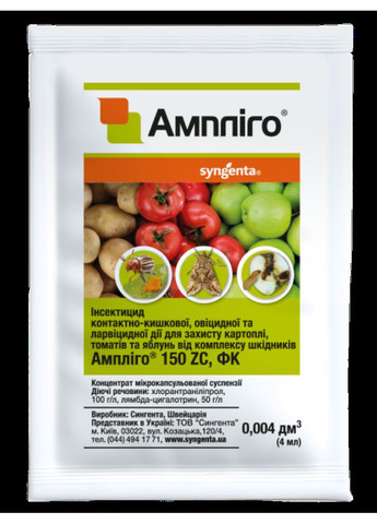 Контактно-проникающий инсектицид широкого спектра действия Амплиго - это новый современный препарат контактно-проникающего действия, сочетающий два активных вещества с различными механизмами воздействия: одно блокирует центральную нервную систему, другое - работу мышц вредителя. Благодаря этому препарат обеспечивает мощный нокдаун-эффект и длительное инсектицидное действие. Формуляция препарата создана по ZEON-технологии в виде микрокапсулированной суспензии. Мелкие капсулы (3–5 мкм) равномерно распределяются по листовой поверхности, крепко прилипают и постепенно высвобождают действующие вещества, что значительно удлиняет период защиты. Такой формат позволяет сохранять высокую эффективность в более широком диапазоне температур по сравнению с традиционными инсектицидами. Нормы внесения Нормы внесения КУЛЬТУРА НОРМЫ РАСХОДА ПРЕПАРАТА НОРМЫ РАСХОДА РАБОЧЕЙ ЖИДКОСТИ ВРЕДНЫЕ ОБЪЕКТЫ КРАТНОСТЬ ОБРАБОТК / СРОК ОЖИДАНИЯ (ДНИ) Яблоня 4 мл на 8-10 л воды 1 кроны) Яблоневая плодожорка и другие листовки, минирующая моль 3/30 Томаты 4 мл на 5 л воды 5 л раствора на сотку Хлопковая совка, листогрызущие совки, трипсы 2/20 Картофель 4 мл на 10 л воды 10 л 2/20 Для достижения максимальной эффективности против чешуекрылых вредителей опрыскивание необходимо проводить в период яйцекладки – начала возрождения личинок (при появлении первых гусениц). ДЕЙСТВИТЕЛЬНОЕ ВЕЩЕСТВО: 100 г/л Хлорантранилипрол + 50 г/л Лямбда-цигалотрин Основные свойства: Высокая эффективность против вредителей в более широком диапазоне температур, чем у других инсектицидов; Инновационная формуляция обеспечивает устойчивость к УФ-излучению и предотвращает смывание дождем уже даже через час после обработки; Высокая эффективность на гусениц независимо от возраста на протяжении всего периода защитного действия; Высокая начальная токсичность, так называемый нокдаун-эффект против чешуек гусениц; Различный механизм действия предотвращает возникновение резистентности. С целью достижения максимальной эффективности Амплиго на рапсе к рабочему раствору рекомендовано добавлять адъюванты органосиликоновой группы. Препарат совместим с большинством средств защиты растений, но в каждом отдельном случае смешивающиеся препараты следует проверять на совместимость.