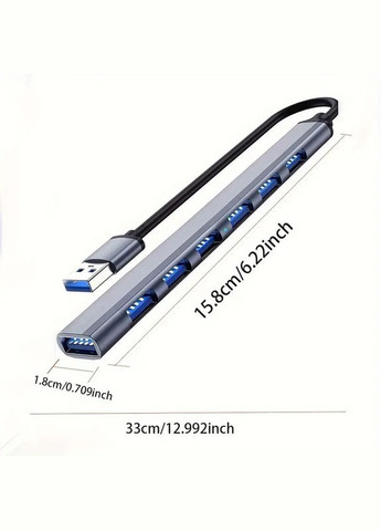 USB-хаб концентратор высокоскоростной 5 Гбит/с 7 в 1 - этот USB-концентратор предназначен для увеличения количества доступных USB-портов на вашем ноутбуке, ПК или другом устройстве. Он позволяет подключить до 7 устройств, используя лишь один USB-разъем на компьютере или другом девайсе. Для функционирования концентратора не требуется установка дополнительных драйверов или программ. Он работает в режиме Plug&Play. В конструкции хаба предусмотрено 7 портов USB-A. Шесть из них соответствуют стандарту USB 2.0 для подключения периферийных устройств и передачи данных со скоростью до 480 Мбит/с. Один порт соответствует стандарту USB 3.0, обеспечивая более высокую скорость передачи данных до 5 Гбит/с и возможность питания подключенных устройств напряжением 5V/0.9A. Концентратор совместим со многими устройствами, оснащенными портом USB-A, включая ноутбуки, ПК, телевизоры и мониторы. Он поддерживает операционные системы Windows (XP/Vista/7/10), MacOS (10.X и выше), Linux и Android. Концентратор идеально подходит для подключения устройств внешнего хранения данных, флешек, внешних жестких дисков, клавиатуры, мыши, видеокамер, сетевых устройств, многоканальных аудиоустройств и тому подобное. USB-порты могут использоваться как для подключения компьютерной периферии и обмена данными, так и для зарядки устройств. Гаджет занимает минимум места и при необходимости легко помещается в карман. Концентратор изготовлен из анодированного алюминия, что обеспечивает его долговечность и предотвращает перегрев. Питание устройства от порта USB без дополнительных источников. Технические характеристики: Интерфейс подключения: USB-A 3.0 Количество входных портов: 7 Тип входных портов: 1 x USB 3.0, 6 x USB 2.0 Скорость передачи: USB 3.0 - 5 Гбит/с, USB 2.0 - 480 Мбит/с Совместимые ОС: Windows, MacOS, Linux, Android Входное напряжение: 5~20V / 3A Выходное напряжение: 5V/0.9A Материал: алюминиевый сплав Длина кабеля: 9 см Размеры: 240 х 16 х 8,5 мм Вес: 61г Комплект поставки: USB-хаб концентратор высокоскоростной 5 Гбит/с 7 к 1 - 1 шт переходник на Type-C в подарок Тип: USB 2.0 - 6 портов и 1 порт - USB 3.0 Цвет: Серый