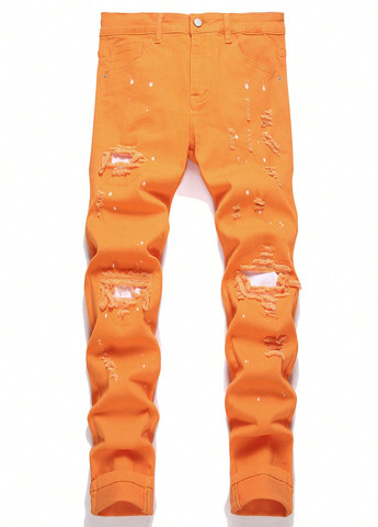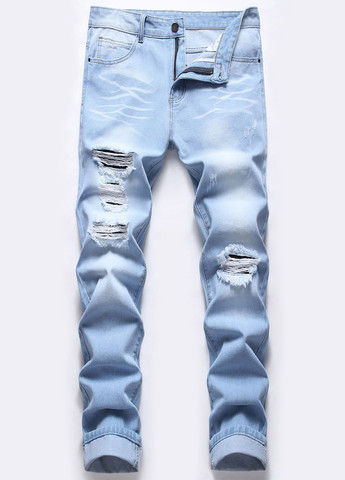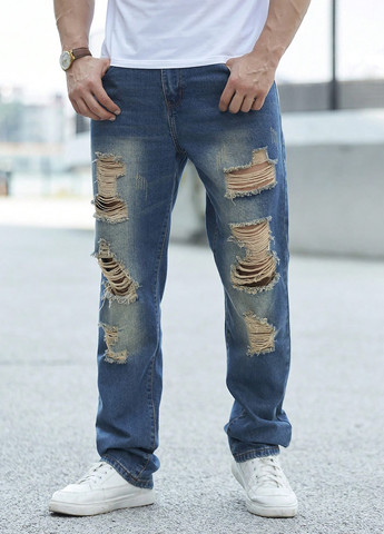 Мужские эластичные облегающие джинсы Slim Fit. Эти джинсы обеспечивают узкую, облегающую посадку из ткани средней эластичности. Особенности включают карманы, застежку-молнию и естественную среднюю талию. Также имеются рваные детали.