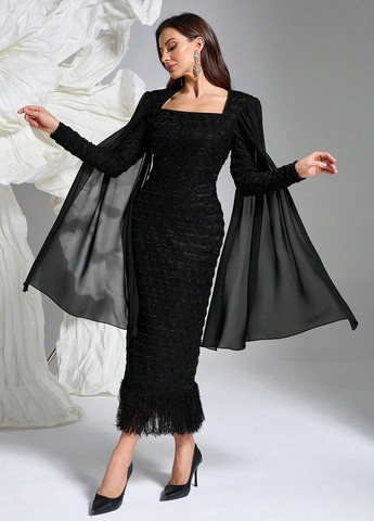 Это женское платье оверсайз трапециевидного кроя – стильный выбор для любого случая. Изготовлен из легкой костюмной ткани с легким бликом, она сочетает комфорт и элегантность. Свободный круглый вырез придает простоту, а украшение искусственным мехом в виде перьев придает изящество и изящество. Однотонный дизайн позволяет легко дополнять платье аксессуарами, создавая гармоничный образ для разных событий.
