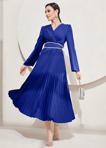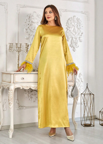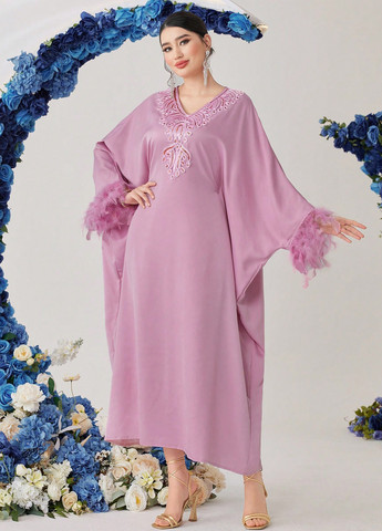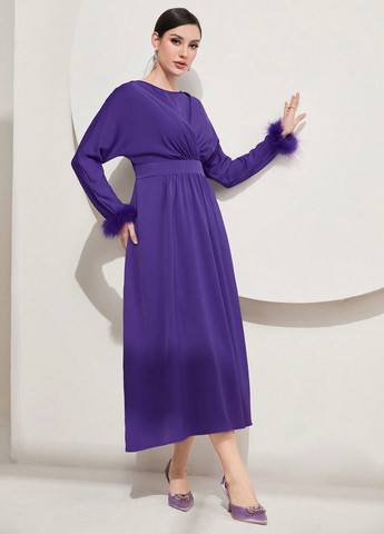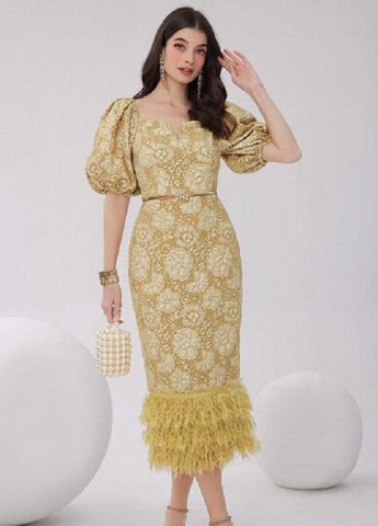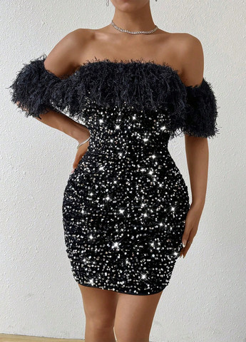 Платье имеет вырез в форме сердца, длинные рукава и завышенную талию. Модель имеет стандартный крой, мини-длину и карандашный низ. Платье выполнено из неэластичной ткани, имеет завышенную талию и длинные стандартные рукава, украшенные отделкой из искусственного меха и украшениями из перьев.