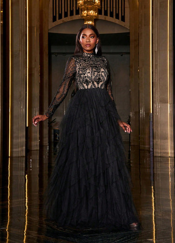 Материал Лайкра, Полиэстер, Трикотаж, Фатин / Цвет Черный / Фасон Оверсайз, А-силуэт / Длина изделия Миди и ниже колена / Стиль Праздничный, Коктейльный, Вечерний