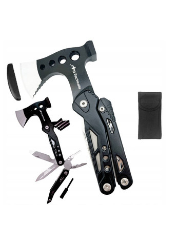 1x Мультитул JB Tacticals 17в1 топор + кейс + резиновый чехол для лезвия топора. Представляем вам мультиинструмент 17 в 1, незаменимый в каждой мастерской, гараже, кемпинге или дома. Этот инструмент имеет много полезных функций, облегчающих выполнение различных задач. Топор Держатель для бит (магнитный) Молоток Нож Пилка Плоская отвертка Файл Открывалка для бутылок Кремень Свисток Съемник изоляции Кусачки для проволоки Ключ для болтов/гаек Длинные плоскогубцы Крестовина CRV PH1 CRV SL 4,5 плоская коронка Крестовина CRV PH2 Особенности инструмента: Топор – позволяет легко и быстро рубить дрова, ломать ветки и другие материалы. Держатель битов (магнитный) – позволяет легко и быстро заменять разные биты. Молоток – используется для забивания гвоздей или удаления их из различных материалов, например, дерева или металла, также может использоваться как разбиватель стекла в экстренных ситуациях Нож – полезен для резки различных материалов, например, бумаги, ткани, кожи и т.д. Пила – позволяет точно резать дерево, пластик, металл и другие материалы. Плоская отвертка – используется для закручивания или откручивания винтов с плоской головкой. Напильник – полезен для обработки дерева, металла и других материалов. Открывалка для бутылок позволяет легко и быстро открывать бутылки. Трут – использовался для разведения очага в поле или во время кемпинга. Свисток – может пригодиться в случае опасности или необходимости привлечь внимание. Съемник изоляции – позволяет безопасно снять изоляцию с электрических проводов. Кусачки для проволоки – позволяют точно разрезать провода. Ключ для болтов/гаек – используется для закручивания или откручивания различных болтов или гаек. Длинные плоскогубцы – используются для точного увлечения и манипулирования предметами. Крестовина CRV PH1 – полезна для закручивания или откручивания винтов с помощью Phillips PH1. Насадка плоская CRV SL 4.5 – используется для закручивания или выкручивания шурупов с плоской головкой размером 4.5. Крестовина CRV PH2 – полезна для закручивания или откручивания винтов с головкой Phillips PH2. Инструмент имеет форму топора, с другой стороны находится молоток/стеклолом, а внизу инструмента расположены складные плоскогубцы с лезвиями, что позволяет легко хранить и транспортировать.