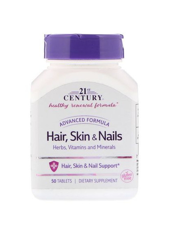 21st Century Hair Skin and Nails Advanced Formula - это комплекс который предназначен для обеспечения структуры, прочности, поддержки и эластичности волос, кожи и ногтей. Он сочетает в себе наиболее известные питательные вещества для поддержания естественной красоты.Комплекс содержит растительные компоненты, аминокислоты и другие питательные вещества, необходимые для здорового вида кожи, волос и ногтей.Как принимать:Принимать по 1 таблетке два раза в день во время едыСодержание элементов в 1й порции 1 таблеткаВитаминыВитамин А (пальмитат) 750 мкгВитамин С (аскорбиновая кислота) 50 мгВитамин D3 (холекальциферол) 1,2 мкгВитамин Е (dl-альфа-токоферилацетат) 25 мгВитамин В1 (тиамин мононитрат) 5 мгВитамин В2 (рибофоавин) 5 мгВитамин В3 (ниацин) 7,5 мгВитамин В4 (хоин битартрат) 25 мгВитамин В5 (пантотенат d-кальция) 15 мгВитамин В6 (пиридоксин гидрохлорид) 6,5 мгВитамин В7 (биотин) 25 мкгВитамин В8 (инозит) 10 мгВитамин В9 (фолат) 42 мкг- Витамин В9 (фолиевая кислота) 25 мкгВитамин В10 (парааминобензойная кислота) 10 мгВитамин В12 (цианокобаламин) 25 мкгМинералыКальций (дикальцийфосфат и карбонат кальция) 125 мгЖелезо (стеарилфумарат) 3,3 мгФосфор (дикальцийфосфат) 58 мгЙод (йодистый калий) 150 мкгМагний (оксид магния) 20 мгЦинк (глюконат цинка) 0,6 мгМарганец (сульфат марганца) 0,6 мгКалий (йодистый калий и сульфат калия) 5 мгБетаин гидрохлорид 10 мгDNA (дезоксирибонуклеиновая кислота) 10 мгRNA (рибонуклеиновая кислота) 10 мгТирозин 7,2 мгЦистеин гидрохлорид 3,5 мгСоевый белок (аминокислотная смесь) 50 мгглутаминовая кислота, лизин, лейцин, аспарагиновая кислота, изолейцин, валин, аланин, аргинин, гистидин, серин, треонин, глицин, орнитин гидрохлоридЗапатентованные травяные смеси 310 мгдрожжи пивные, соевый белок, полевой хвощ, петрушка, шиповник, кресс-салат, водоросли, цитрусовые биофлавоноиды, лецитин, рутин.Ингредиентыцеллюлоза, стеариновая кислота, диоксид кремния, кроскармеллоза натрия, искусственных красителей (FD&C Blue# 2 Carmine, FD&C Red# 40), аскорбил пальмитата, BHA, BHT, желатина, гуммиарабика, гидроксипропилметилцеллюлозы, стеарата магния, ПЭГ, поливинилового спирта, крахмала, сахарозы, талька, диоксид титана, растительное масло, вода