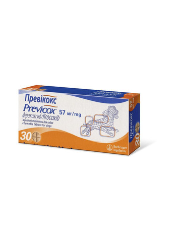Препарат Boehringer Ingelheim Previcox для лечения остеоартрита у собак, 57 мг Boehringer Ingelheim Превикокс – нестероидный противовоспалительный препарат для собак и щенков с 10-ти недельного возраста и массой тела от 3 кг. Состав 100 мг препарата содержит действующее вещество: фирококсиб – 24 мг. Вспомогательные вещества: моногидрат лактозы, микрокристаллическая целлюлоза, гидроксипропилцеллюлоза, кросскарамелоза, кремния диоксид коллоидный безводный, ароматизатор со вкусом копченого мяса, карамель (Е150d), оксид железа (Е172). Фармакологические свойства Фирококсиб – это нестероидный противовоспалительный препарат (НПВП) из группы коксибов, действующий путем селективного ингибирования циклооксигенгеназы-2 (ЦОГ-2) – опосредованного синтеза простагландина. ЦОГ-2 является изоформой фермента, которая, как было продемонстрировано, стимулируется провоспалительными факторами и, вероятно, отвечает за синтез простаноидных медиаторов боли, воспаления и лихорадки. Коксибы, в свою очередь, проявляют обезболивающие, противовоспалительные и жаропонижающие свойства. Также считается, что ЦОГ-2 принимает участие в овуляции, имплантации и закрытии артериального протока, и функциях центральной нервной системы (вызывание лихорадки, восприятие боли и когнитивная функция). В in-vitro анализах цельной крови собак фирококсиб проявляет примерно в 380 раз большую селективность к ЦОГ-2 по сравнению с ЦОГ-1. Концентрация фирококсиба, необходимая для ингибирования 50% фермента ЦОГ-2 (т.е. IC50) составляет 0,16 (± 0,05) мкмоль, в то время как необходимая концентрация IC50 для ингибирования ЦОГ-1 составляет 56 (± 7) мкмоль. > После перорального применения у собак в рекомендуемой дозе 5 мг на 1 кг массы тела фирококсиб быстро всасывается, и время до достижения максимальной концентрации (Tmax) составляет 1,25 (± 0,85) часов. Пиковая концентрация (Cmax) составляет 0,52 (± 0,22) мкг/мл (эквивалентна около 1,5 мкмоль), площадь под кривой концентрация-время (AUC 0-24) составляет 4,63 (±1,91) мкг x час/мл, а биодоступность при пероральном применении составляет 36,9 (± 20,4) процента. Период полувыведения составляет 7,59 (±1,53) часов. Фирококсиб почти на 96% связывается с белками плазмы. При многократном пероральном применении равновесная концентрация достигается до третьей суточной дозы. Фирококсиб метаболизируется главным образом из-за деалкилирования и глюкуронирования в печени. Вывод происходит главным образом из желчи и через желудочно-кишечный тракт. Показания к применению Превикокс назначают собакам как противовоспалительное, жаропонижающее и анальгезирующее средство при остеоартрозах, а также после операций на мягких тканях, ортопедических и стоматологических операций. Дозы и способы введения животным всех возрастов Препарат применяют собакам перорально во время еды или самостоятельно в дозе 5 мг на 1 кг массы тела животного один раз в сутки согласно таблице: Дозировка Превикокса для животных по массе тела Масса тела животного (кг) Превикокс 57 мг Превикокс 227 мг 3,0 - 5,5 0,5 5,6 – 7,5 0,75 7,6 - 10 1 0,25 10,1 - 13 1,25 13,1 - 16 1,5 16,1 – 18,5 1,75 18,6 – 22,5 0,5 22,6 - 34 0,75 34,1 - 45 1 45,1 - 56 1,25 56,1 - 68 1,5 68,1 - 79 1,75 79,1 - 90 2 Длительность курса лечения при остеоартритах зависит от состояния животного и определяется лечащим ветеринарным врачом. Применение препарата более 90 дней следует проводить под регулярным контролем ветеринарного врача. Для облегчения послеоперационной 