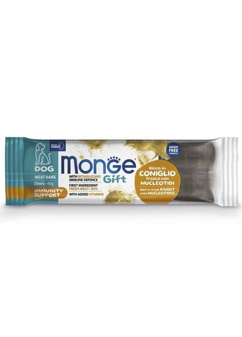 Отсутствие злаков (глютена) делает этот продукт пригодным для собак с пищевой чувствительностью, а наличие легкоусвояемого белка из рыбы и кролика придает лакомству высокую биологическую ценность. Формула богата витаминами, способствующими ежедневной бодрости, и функциональными ингредиентами, такими как нуклеотиды, обеспечивающие всемерную поддержку организма питомца. Если вы заботитесь о полноценном питании и благополучии собаки, лучшим решением будет выбрать лакомство для собак от итальянского бренда Monge Gift. Monge – это проявление заботы и любви, выраженное в каждом лакомстве! Чем полезны жевательные палочки для собак? Источник высококачественного белка для поддержания мышечной массы и укрепления костей. Витамины и функциональные ингредиенты для укрепления иммунитета. Профилактика образования зубного камня и удаление зубного налета. Массаж десен и удовольствие от жевания снижают стресс и избавляют от скуки. Эффективный инструмент дрессировки и вкусное поощрение за хорошее поведение. Достоинства и особенности: 100% натуральные ингредиенты; без искусственных добавок; гипоаллергенные; способствуют здоровью зубов; обеспечивают блеск и здоровье шерсти; укрепляют защитные силы организма. Ингредиенты: Свежая рыба (65%), свежий кролик (14%), сушеная рыба (лосось и форель), гидролизат рыбного белка (лосось), порошок целлюлозы, продукты дрожжей (бета-глюканы 0,85%, нуклеотиды 0,12%). Гарантированный анализ: сырой белок: 41%, сырая клетчатка: 3%, сырой жир: 16,5%, сырая зола: 8%, влажность: 20%. Пищевые добавки/кг: Витамин А (ретинилацетат) 5000 МЕ, витамин D3 500 МЕ, витамин Е (алл-рац-альфа-токоферилацетат) 50 мг, таурин 1000 мг. Метаболизированная энергия: 3240 ккал/кг. Рекомендации по кормлению: Дневная порция для взрослой собаки массой 20 кг составляет до 2 батончиков в день. Регулируйте и улучшайте рацион с использованием полнорационного корма для собак. После открытия упаковки продукт можно использовать в течение 4 недель. Важно обеспечивать постоянный доступ к свежей и чистой воде. Лакомство предназначено исключительно для собак и не подходит для употребления людьми. Фасовка: 45 г