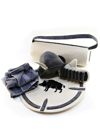 В нашем магазине Вы можете приобрести разные вариации подарков. Данный набор - оригинальный подарок и незаменимый банный аксессуар. Все банные атрибуты набора помещаются в сумку, внутрь которой вшит водонепроницаемый ацетат. Он позволяет спокойно переносить влажные и полностью мокрые вещи без боязни, что влага пропитает сумку. В набор входит: - шапка Охотника универсального размера, - коврик с кабаном диаметром – 60 см, - рукавица-мочалка с декором - сумка со вставкой на молнии (размер: длина – 55 см, диаметр – 20 см, длина ручки – 80 см) - махровое парео 140*70 см