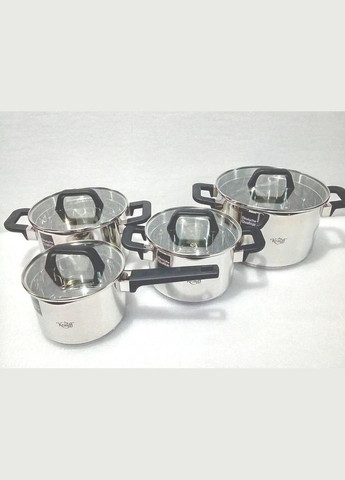 Характеристики Набор посуды Krauff Saporis 12 предметов 26-242-051 Бренд Krauff Тип набор посуды Сфера применения для всех разновидностей плит Цвет производителя серебряный Материал ручки нержавеющая сталь с силиконовыми вставками Тип крепления ручки на заклепках Материал 1 Материал крышки термостойкое стекло Упаковка фирменная коробка Комплектация кастрюля 1.5 л с крышкой, кастрюля 3 л с крышкой, кастрюля 2 л с крышкой