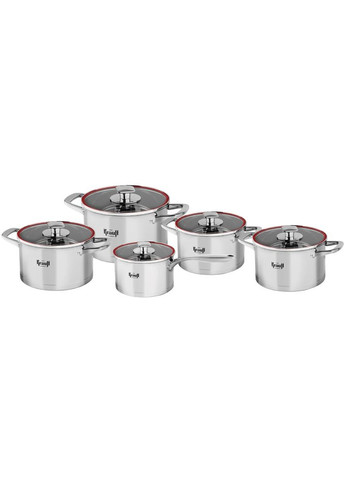 Набор посуды из 10 предметов базовый набор из нержавеющей стали со стеклянными крышками. , предназначенный для удобного приготовления любых блюд: от бульонов и соусов – до гарниров и компотов. Объемы подобраны для нужд разного количества порций – от небольшой семьи до крупной компании. В комплекте: ковшик 2,0 л кастрюля 2,7 л - кастрюля 3,7 л - кастрюля 4,7 л - кастрюля 6,1 л - 5 стеклянных крышек с отверстием для выхода пара Нержавеющая сталь — практическое решение на ежедневно Корпус кастрюль изготовлен износ, температур и влаги. Посуда сохраняет форму, не тускнеет и подходит для ежедневного приготовления. 5-слойное капсульное дно – равномерное прогревание без пригорания. Многослойное капсульное дно обеспечивает быстрый и равномерный нагрев. , что позволяет эффективно готовить без локального перегрева. Посуда сохраняет тепло даже после отключения плиты, что удобно для медленного тушения. Удобство в деталях: - Стеклянные крышки с отверстием для выхода пара – для визуального контроля без открывания. - Измерительная шкала внутри каждой кастрюли – точность в дозировке. - Удобные металлические ручки – надежные и эргономичные. Подходит для всех типов плит, включая индукцию.