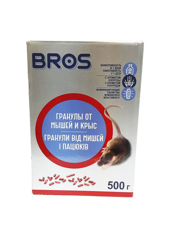 Предназначение гранул с мумификатором Bros 90 г Мыши и крысы могут завестись где угодно. Проникая в жилые помещения, они наносят большие ущербы провианту. Особо страдают от грызунов сельскохозяйственные производители. Следует обеспечить комфортные условия для хранения запасов. В случае обнаружения грызунов, принимайте радикальные меры. Это сведет к минимуму возможные потери. Гранулы от грызунов Bros ликвидируют мышиные атаки. Средство служит приманкой, имеет химический принцип действия. Крысы, не предполагая, что в гранулах таится опасность, поедают приманку, удовлетворяя свое желание что-то грызть. Они являются переносчиками заболеваний и быстро заражают все семейство. Крысы и мыши обладают тонким обонянием, потому важно, чтобы посуда, в которую насыпается яд, не имела посторонних запахов. Насыпать отраву нужно в местах обитания грызунов и периодически нужно проверять количество съеденной приманки. Наберитесь терпения, и результат вскоре вас порадует. Состав гранул с мумификатором Bros Средство представлено в виде гранул, в его составе: Специальные ароматизаторы, которые приманивают грызунов Мумификатор Преимущества Гранулы безопасны для человека и окружающей среды Стоят недорого Не занимают много места Гранулы эффективно действуют даже при минимальном расходе Не только уничтожают, но и мумифицируют грызунов Идеально подходят для закрытых помещений, актуальны для открытых пространств Средство продается в пакетике. Фасовка экономичная, весом по 90 грамм. В упаковке – 20 штук. Продукт отлично транспортируется, не боится перепадов температур и атмосферного давления, не теряет свойств в открытой упаковке. Может долго храниться. Расход: Мыши - до 50 г на каждые 10 кв.м Крысы - до 100 г на каждые 10 кв.м