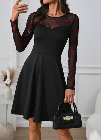 Платье в стиле пэчворк SHEIN LUNE. Это платье имеет лоскутный дизайн и вырез на спине. Оно имеет облегающий крой и высокую талию. Платье включает контрастную сетку и прозрачные детали. Оно застегивается на молнию. Ткань сильно тянется и имеет расклешенный подол. Оно имеет круглый вырез и обычные рукава.