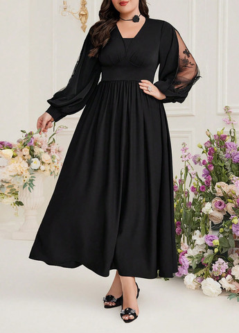 Элегантное платье-макси с присборенными деталями и сетчатыми вставками на рукавах с вышивкой. Модель выполнена из тканого материала, имеет V-образный вырез, длинные рукава и стандартную посадку.