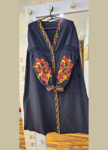 Черное платье с вышивкой изготовлена из натуральной ткани - штапель. Вышитый объемный рукав на манжете. Под пояс.