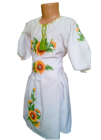 Это детское платье, изготовленное из натуральной ткани светлого оттенка. Его украшает вышивка, выполненная в нежных пастельных тонах, которая придает образу легкости и изящества. Особой деталью есть нашивка голубого цвета, которая служит ярким акцентом и подчеркивает оригинальный дизайн. Платье имеет удобный крой, не ограничивающий движения ребенка. Это идеальный вариант для праздничных событий, фотосессий или повседневной носки.