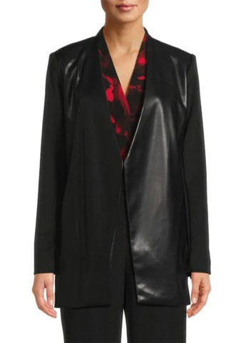 Пиджак Calvin Klein. Изящные линии пиджака из искусственной кожи  c текстильными вставками от Calvin Klein можно сочетать с бесчисленными нарядами, делая его незаменимым элементом гардероба. Стильный пиджак из экокожи без застежек. Два боковых кармана. Рукава и спинка текстильные. Есть подкладка. Отличное качество. Машинная стирка.