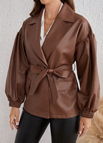 Эта куртка из искусственной кожи имеет круглый вырез, длинные рукава в стиле бараньей ножки и открытую переднюю часть на молнии. Он не имеет карманов и имеет стандартную посадку. Куртка выполнена из слегка эластичной ткани и имеет повседневный стиль.