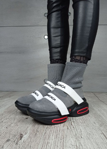 Серые женские ботинки из обувного текстиля и экозамши. Сверху два белых ремешка на липучке. Подошва выполнена в черном цвете и декорирована красными вставками. Высота подошвы 6,5 см.Размерная сетка (Размер/Длина стельки):36 - 23 см37 - 23,5 см38 - 24 см39 - 24,540 - 25 см