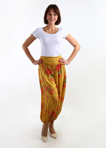Стильные женские брюки выполнены из легкой ткани..свободного кроя в цветочный принт. Без застежки, на резинке. Состав: 100% вискоза. Замеры изделия: 42-44р-Полуобхват стегона 59см, Полуобхват талии 33см, Длина изделия 92см.