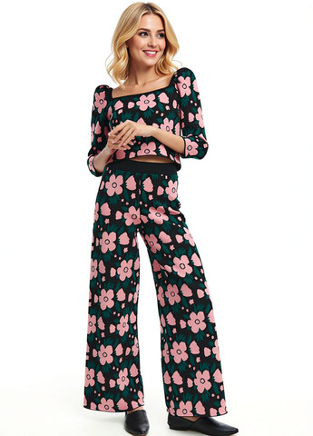 - Цветочные рисунки. В моду вошли принты в виде крупных черно-белых или цветных тропических растений и цветов. Красиво такие узоры выглядят на брюках и штанах прямого или зауженного кроя, клеш, укороченных. Желательно, чтобы фоновый материал был черного, чернильного, бордового, изумрудного или другого насыщенного темного цвета.