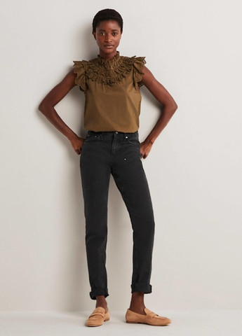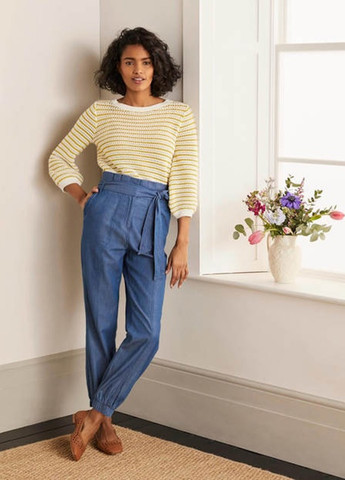 Бриджи кюлоты, плотный деним, однотонные, высокая талия, застежка на молнии и крючке, сзади два прорезных кармана, два боковых прорезных кармана, пояс-лента. На размер 6Р длина по внутреннему шву 57 см, ширина по низу изделия (полуобхват) 27 см.