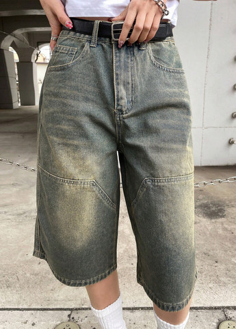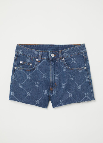 Короткие шорты с пятью карманами из стираного денима с рисунком. Модель с высокой талией и необработанным нижним краем.