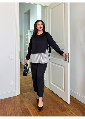 Стильная кофта интересного кроя из качественной двунитки и декоративными вставками из крепостюмки. Посредине – рабочая молния с канатом в тон ткани, на груди – аккуратная вставка с накатом, придающая модели стильности и уникальности. Рукава завершены манжетами, что делает посадку комфортной и аккуратной.